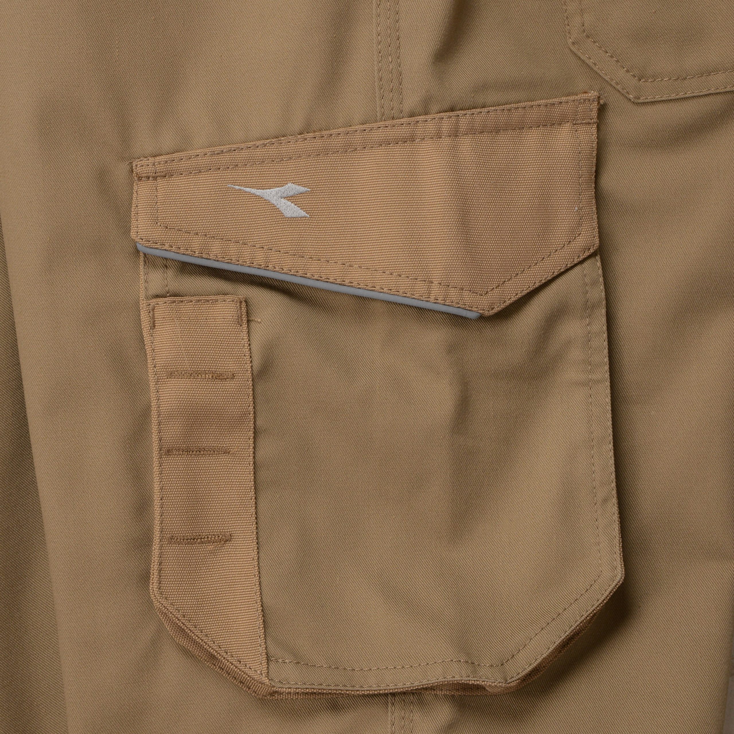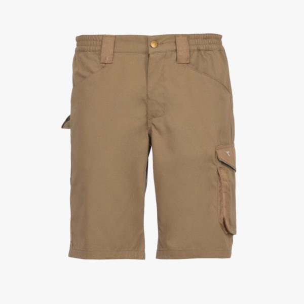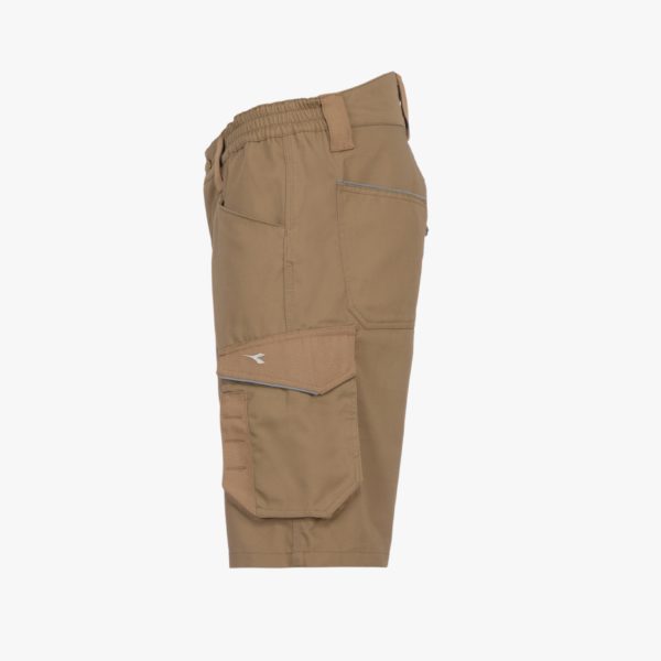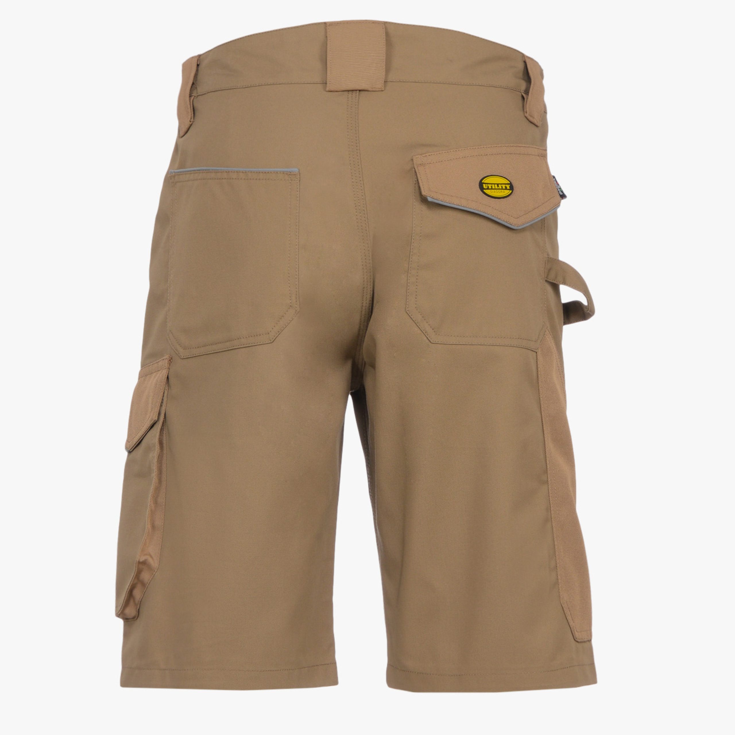 Bermuda con tasche laterali, dettagli rifrangenti, tasca portametro, portamartello e dettagli canvas in poliestere antiabrasione, elastico in vita, tripla cucitura.