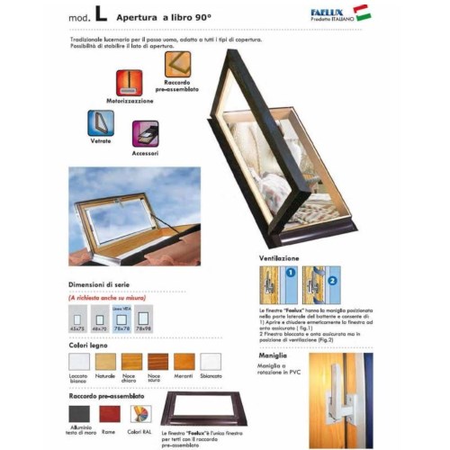 Il lucernario a libro mod. L proposto da Faelux, è la finestra per uscire comodamente e senza pericolo sul tetto. Semplice e robusta, offre inoltre un’apertura regolabile in due diverse posizioni. La maniglia, con doppia chiusura, permette la chiusura arieggiante in posizione di sicurezza.