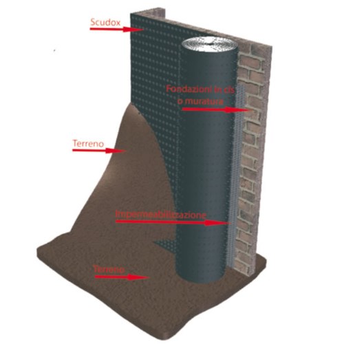 Scudox è una membrana bugnata impermeabilizzante ideale per proteggere le fondazioni ed i muri interrati. Scudox, realizzato in HDPE, viene posato sulla superficie delle murature e consente una totale separazione tra i muri, sia di calcestruzzo che in muratura, e l’umidità del terreno, grazie alla presenza di oltre 1850 bugne al mq, che tenendo staccata la membrana di circa 8 mm, formano un volume d’aria pari a 5,5 l/mq.