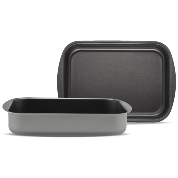 Teglia rettangolare in alluminio con rivestimento interno in antiaderente privo di PFOA e fondo finito con diamante. Lavabile in lavastoviglie. Linea Fireworks. Spessore 1,5 mm.