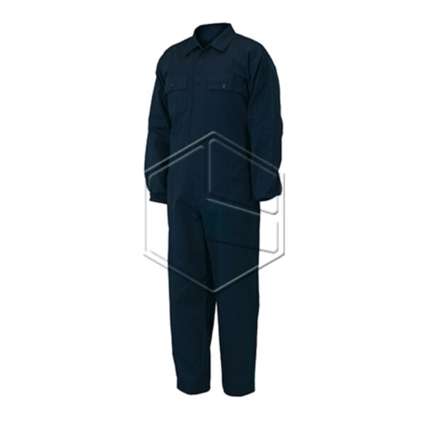 Tuta cotone con due tasche applicate e due taschini applicati con pattina chiusa con bottone. Tasca posteriore chiusa con bottone e tasca porta metro. Elastico in vita sulla parte posteriore. Elastico rimovibile ai polsi. Chiusura con cerniera in nylon ricoperta da patta. Collo a camicia. Composizione 100% cotone.